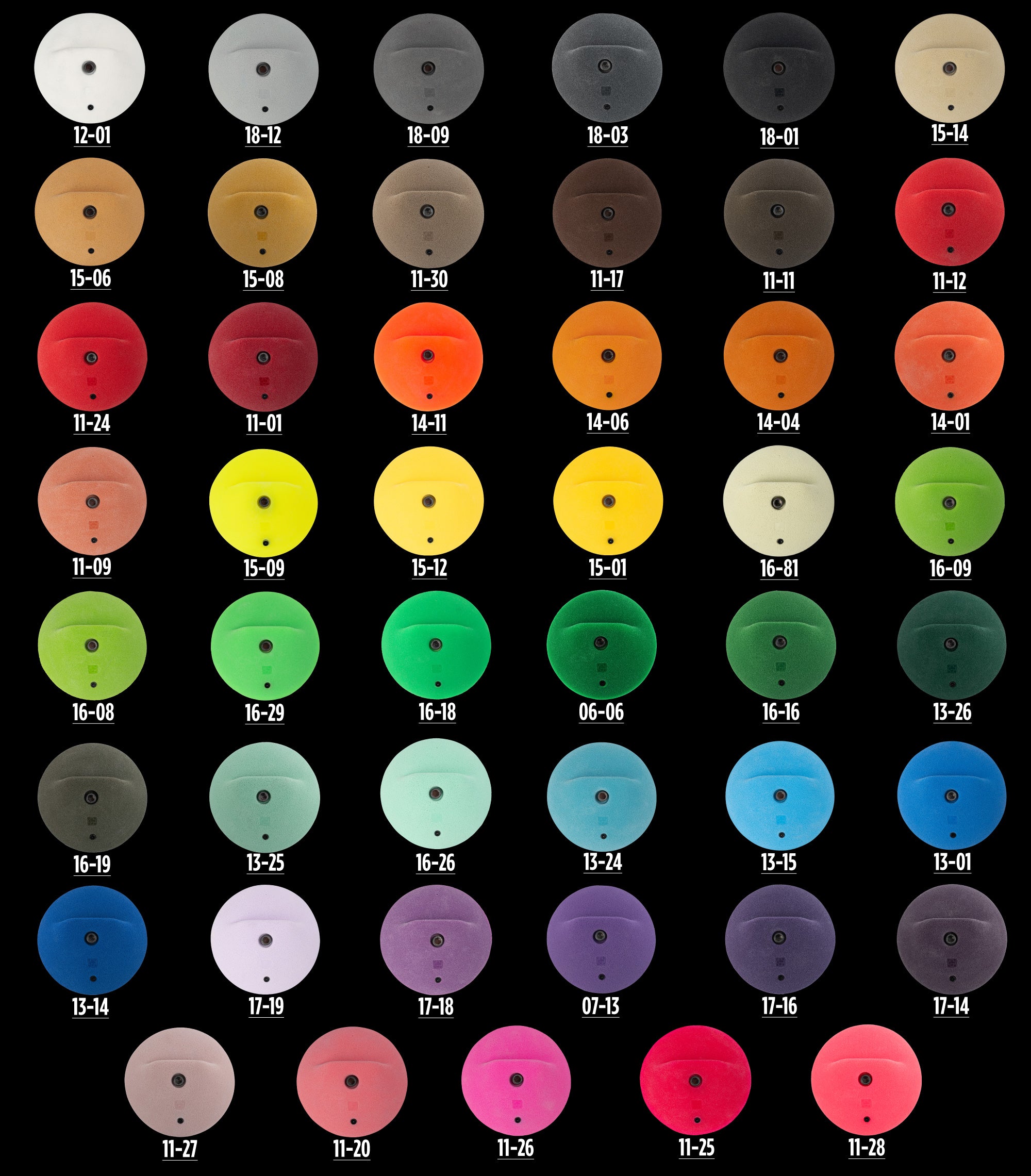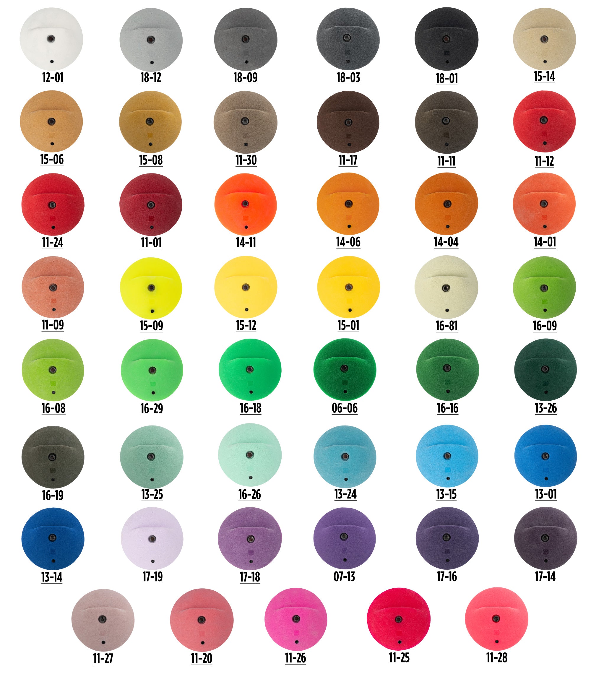 Varying levels of the amount of the ball that is exposed providing varying levels of incut. Awesome for steep walls as sometimes normal half dome slopers are very difficult. These allow you to get your hand behind it even on a 45°. This set I particular I love because they can also be used as pinches. They range in size from baseball to softball. The sloped edges make this awesome to to force certain moves and accuracy.